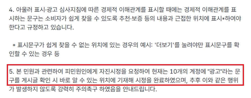 경제적 이해관계를 표시할 때에는 경제적 이해관계를 표시하는 문구는 소비자가 쉽게 찾아볼 수 있도록 추천·보증 등의 내용과 근접한 위치에 표시해야 한다는 게 '표시·광고 심사지침'이지만, '더보기'를 눌러야만 표시문구를 확인할 수 있거나 표기가 누락되는 경우도 빈번하다는 것이다.