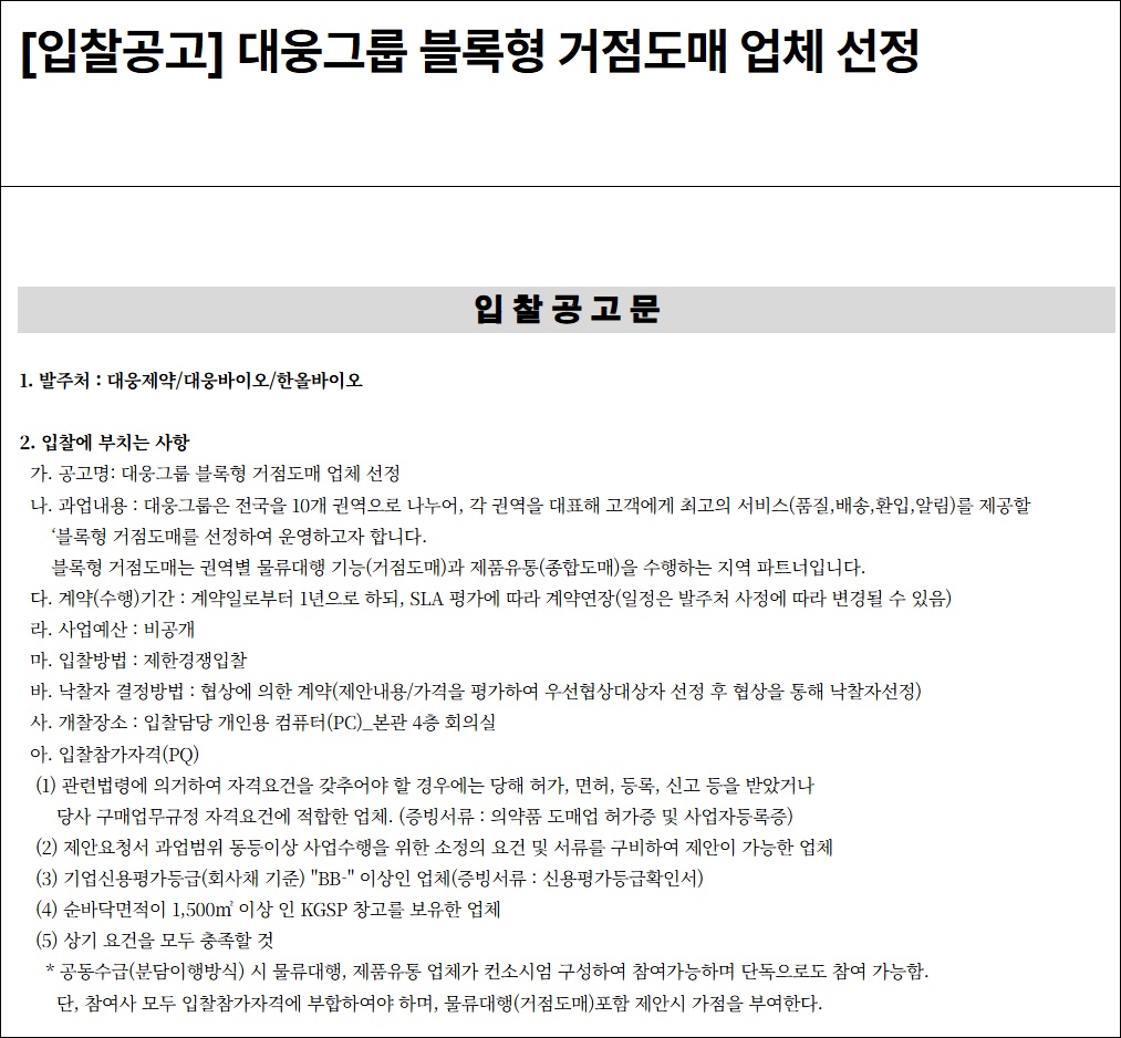 이번 입찰 발주처는 대웅그룹에 소속된 대웅제약, 대웅바이오, 한올바이오로, 회사는 전국을 10개 권역으로 나눠 각 권역을 대표해 의약품 품질, 배송, 환입, 알림 서비스를 제공할 거점도매를 선정해 운영한다고 밝혔다.