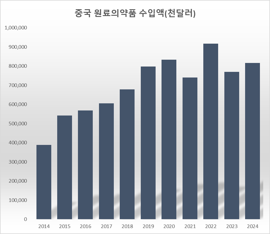 국내 시장에서 사용되는 중국산 원료의약품 비중이 크다. 중국 원료의약품은 지난해 8억1632만달러 규모가 수입됐다. 2014년 3억8831만달러에서 10년 동안 110.2% 치솟았다. 지난해 국내에서 사용된 중국 원료의약품은 1조1159억원 규모라는 계산이 나온다. 내수 시장에서 사용되는 국내산과 중국산 원료의약품이 유사한 수준이라는 의미다. 중국산 원료의약품이 국내산 제품보다 저렴하다는 점을 고려하면 국내 기업의 실제 원료의약품 사용량은 중국산이 국내산을 압도한다는 얘기가 된다.