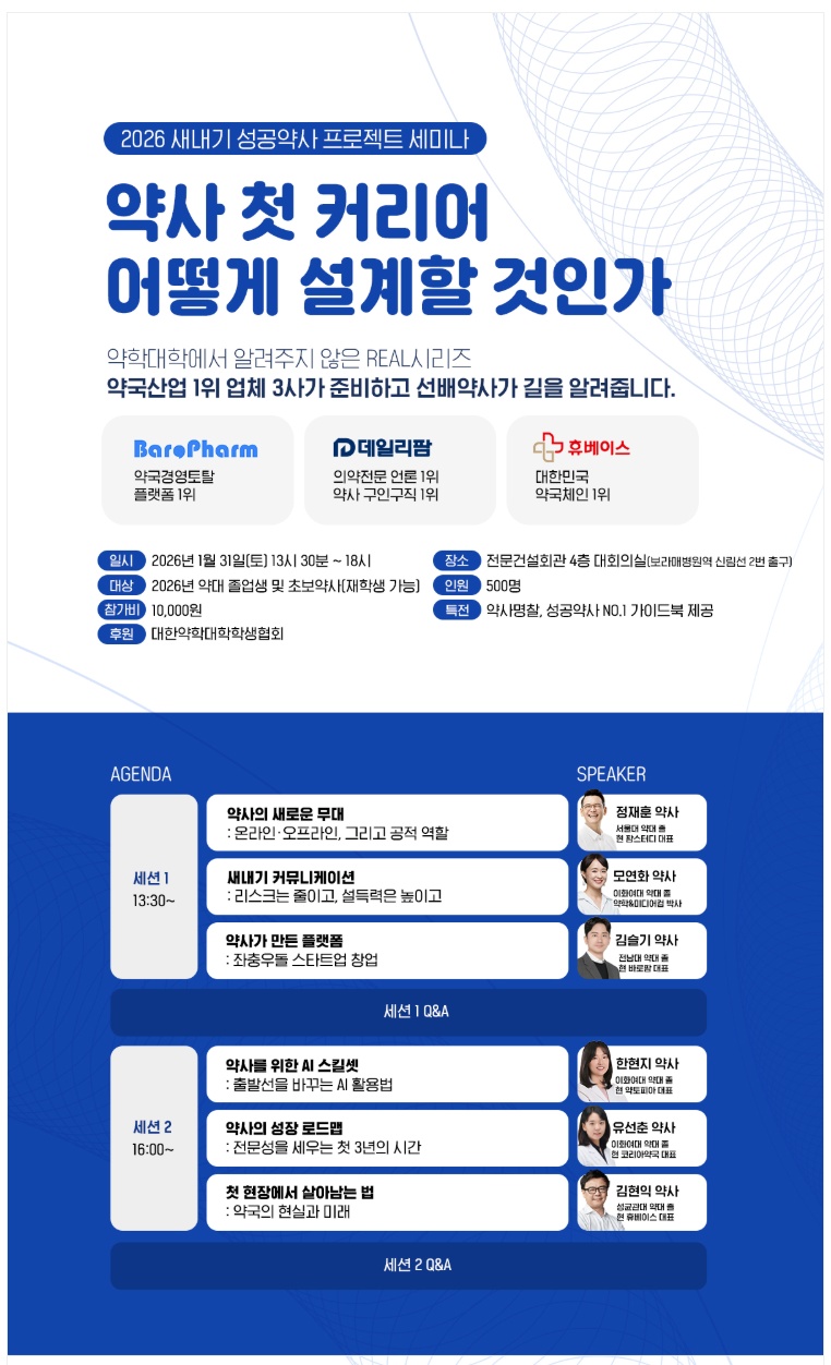 ‘약사 첫 커리어 어떻게 설계할 것인가’를 주제로 한 이번 세미나는 2026년 약대 졸업생 또는 초보약사를 대상으로 한다. 약대 재학생도 참여가 가능하다.