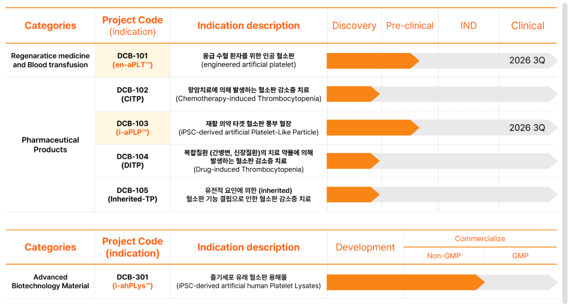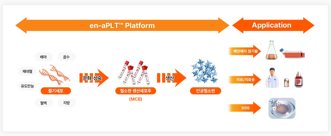 혈소판 대량 생산 플랫폼을 기반으로 수혈용 혈소판, 골관절염 재생치료제, 세포 배양용 배지 첨가물까지 세 갈래 사업을 동시에 추진하며 단계적 상용화를 준비하고 있다.