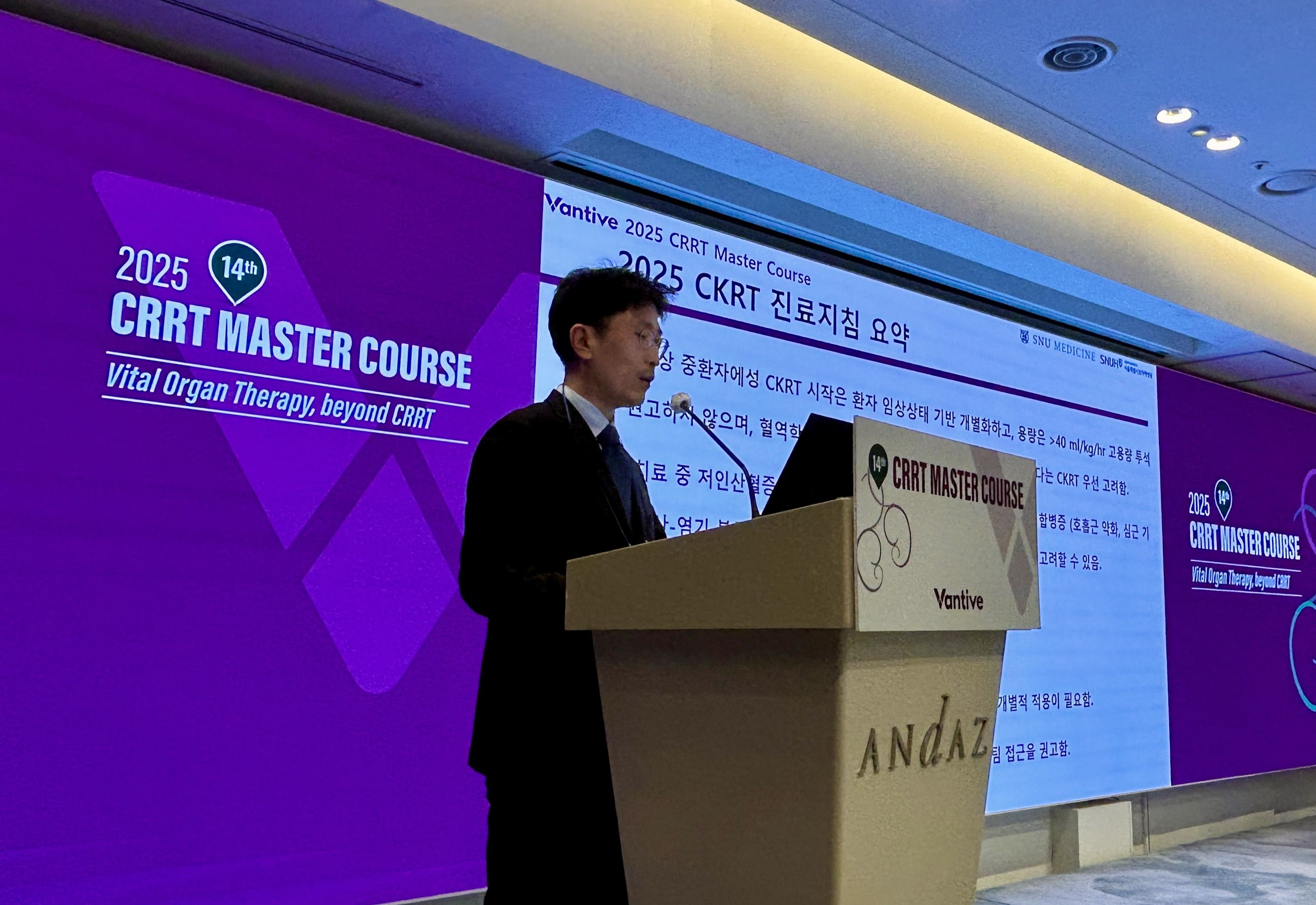 마스터 코스의 첫 번째 세션에서 서울보라매병원 신장내과 이정환 교수는 ‘2025 지속신대체요법을 위한 근거 중심 임상 진료 지침(2025 Evidence-based Clinical Practice Guideline for Continuous Kidney Replacement Therapy)’를 주제로 강연하며 CKRT 치료 표준화의 필요성과 주요 개정 내용을 공유했다.