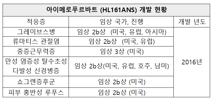 HL161은 현재 '바토클리맙'(MVT-1401)과 아이메로프루바트(IMVT-1402) 두 가지 파이프라인으로 개발되고 있다.