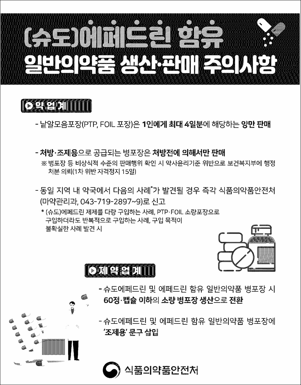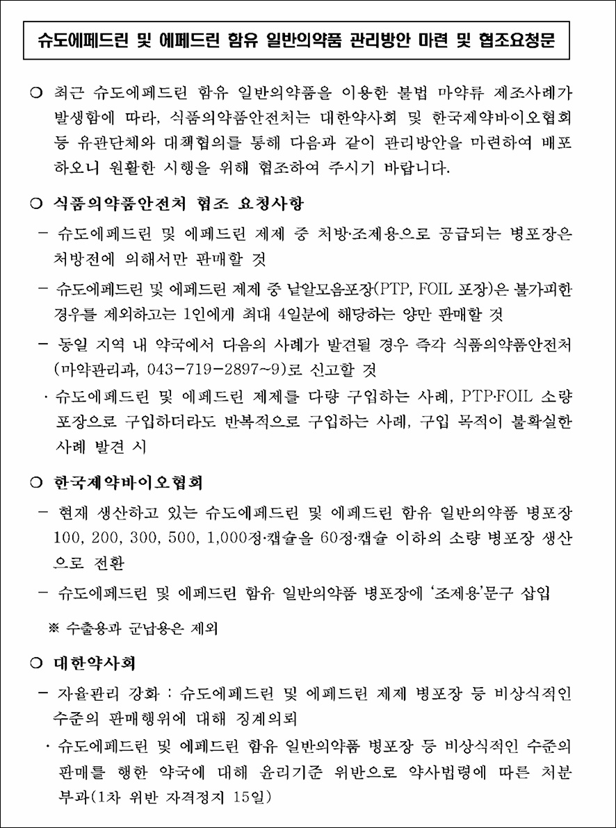 이때 식약처의 협조 요청사항에는 ▲슈도에페드린 및 에페드린 제제 중 처방·조제용으로 공급되는 병포장은 처방전에 의해서만 판매할 것 ▲슈도에페드린 및 에페드린 제제 중 낱알모음포장은 불가피한 경우를 제외하고는 1인에 최대 4일치 양만 판매할 것 등이다.