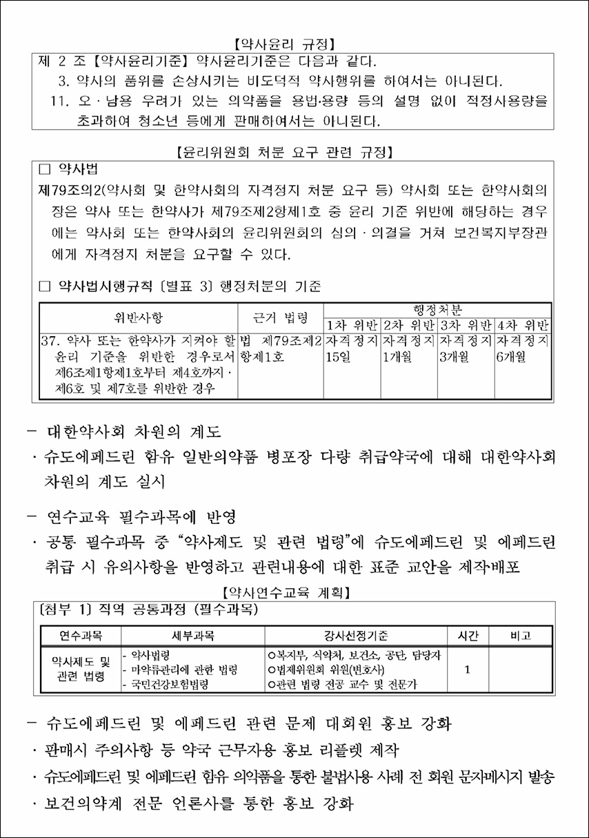 당시 식약처는 또 약사회에 자율관리 강화 방안으로 슈도에페드린이나 에페드린 제제 병포장 등 비상식적 수준의 판매행위에 대해서는 윤리위원회 회부해 관련 내용을 확인하고, 문제가 확인될 시 보건복지부에 징계를 의뢰할 것을 요구하기도 했다.