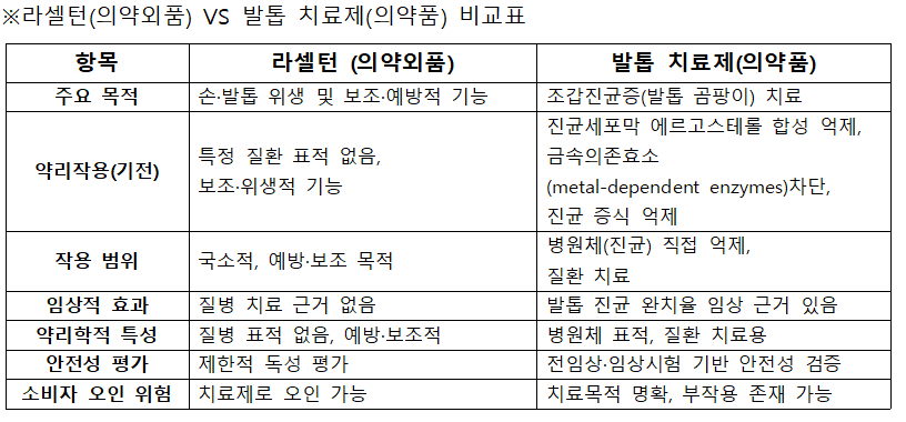약본부는 또 광고 중인 라셀턴(의약외품)과 발톱무좀 치료제(의약품)는 약리학적으로 큰 차이가 있으며, 라셀턴의 경우 치료용 약리 작용이 없고 발톱 진균치료 목적의 의약품과는 명확히 구분된다고 밝혔다.