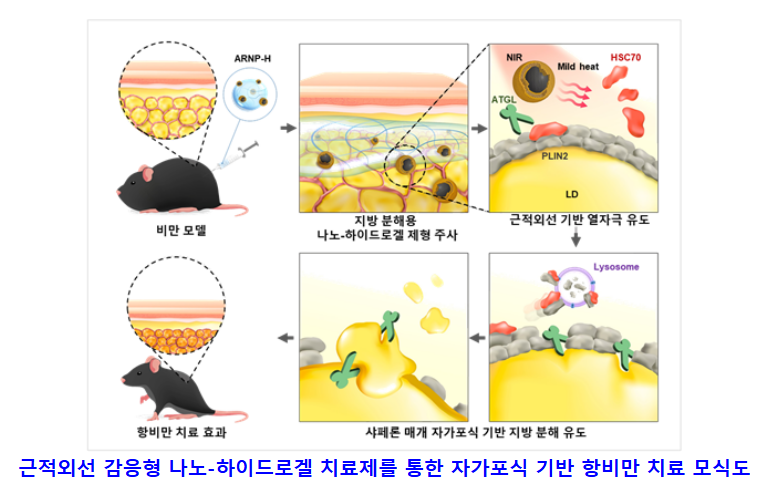 특히 근적외선 빛을 내리쬐면 나노입자가 약한 열 자극을 발생시키고, 이를 통해 CMA의 핵심 단백질인 HSC70이 활성화된다. 그 결과 지방 방울을 보호하던 단백질(PLIN2)이 분해되고, 지방 분해 효소가 지방 방울에 접근할 수 있게 되면서 지방세포에서만 지방 분해가 유도된다.