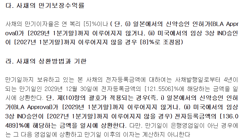 4건의 CB 모두 사채 만기이자율은 연 복리 5%로 설정됐는데 일본에서의 신약승인 인허가가 2029년 1분기 말까지 이뤄지지 않거나 2027년 1분기 말까지 미국 임상 3상시험이 승인되지 않으면 8%로 조정한다는 내용이 반영됐다.