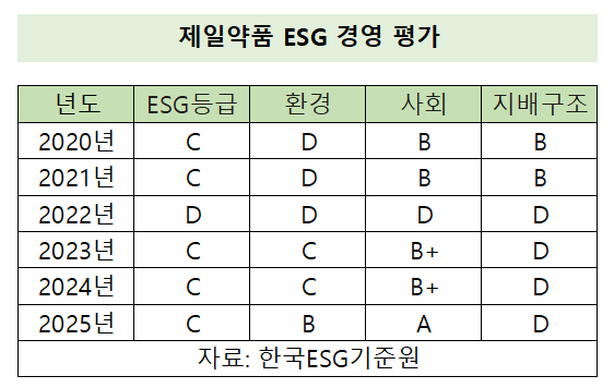 제일약품은 2022년 같은 평가에서 전 항목에서 D등급을 획득했다. 전 항목에서 최저 평가를 받자 2023년부터 전사적인 ESG 경영 노력이 본격화됐다. 환경 부문에서는 친환경 경영 체계 구축, 사회 부문에서는 인적 자원 관리와 안전·보건 체계 고도화에 힘을 쏟았다.