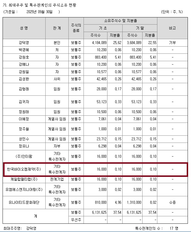 강 대표는 유나이티드제약의 2대주주인 동시에, 바이오켐제약과 유엔에스바이오 등 주요 계열사의 최대주주로 그룹 내 핵심 축을 형성하고 있다. 이런 상황에서 자사주가 바이오켐제약으로 이동한 것은, 개인 지분 확대와 계열사 지분을 통해 오너 2세 중심으로 지분 구조를 정리해 가는 흐름으로 읽힌다.
