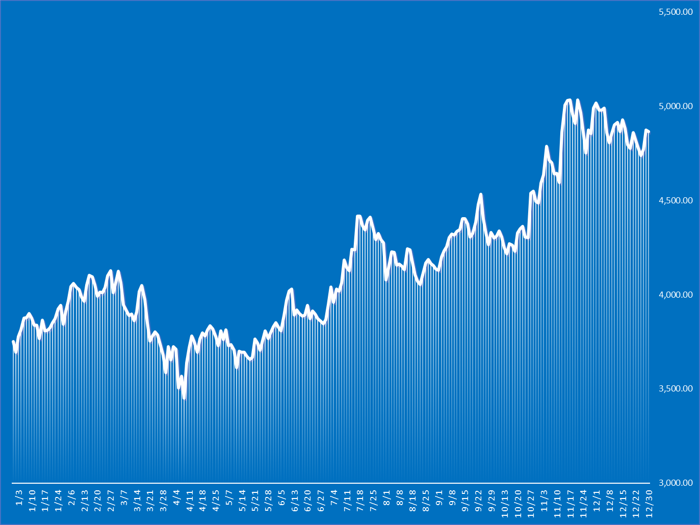 31일 한국거래소에 따르면 지난 30일 KRX헬스케어지수는 4865.56으로 전 거래일보다 0.19% 하락하며 올해 장을 마쳤다. 작년 말 3750.01과 비교하면 1년 동안 29.7% 상승했다. 올해 코스피 지수가 작년 말 2399.49에서 4214.17로 75.6% 오른 것보다 상승률은 저조했지만 지난해에 이어 상승세를 이어갔다. 지난해 말 KRX헬스케어지수는 3750.01으로 1년 전 3163.83에서 18.5%의 상승률을 기록했다.