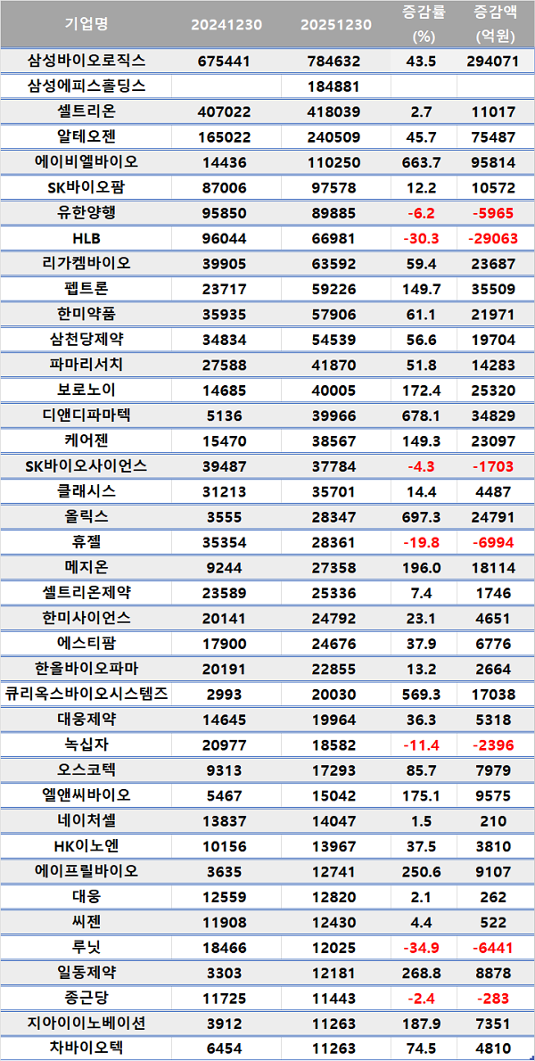 주요 제약바이오기업의 시가총액이 일제히 작년 말보다 증가했다.