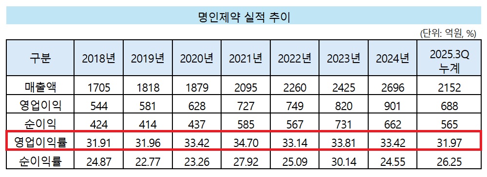명인제약은 2018년 이후 매년 영업이익률 30% 이상을 기록하고 있다. 2025년 3분기 누계 기준 영업이익률도 31.04%를 나타냈다. 같은 기간 누계 매출은 2152억원, 영업이익은 668억원이다. 4분기 실적에 따라 연매출 3000억원, 영업이익 1000억원 동반 돌파 가능성도 거론된다.