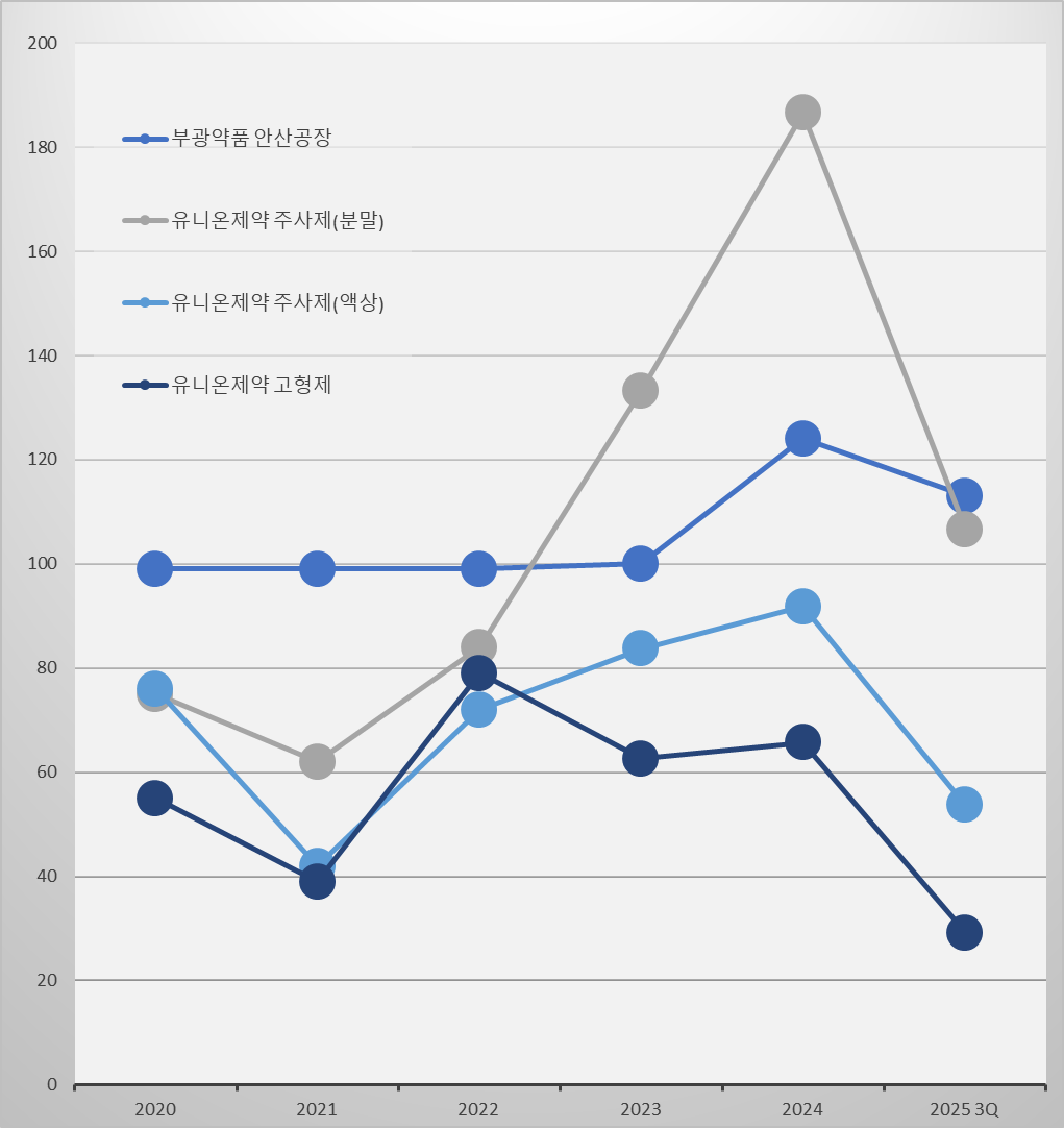 유니온제약의 액상 주사제는 2024년 가동률 92%를 기록했는데 지난해 3분기에는 54%로 급감했다.