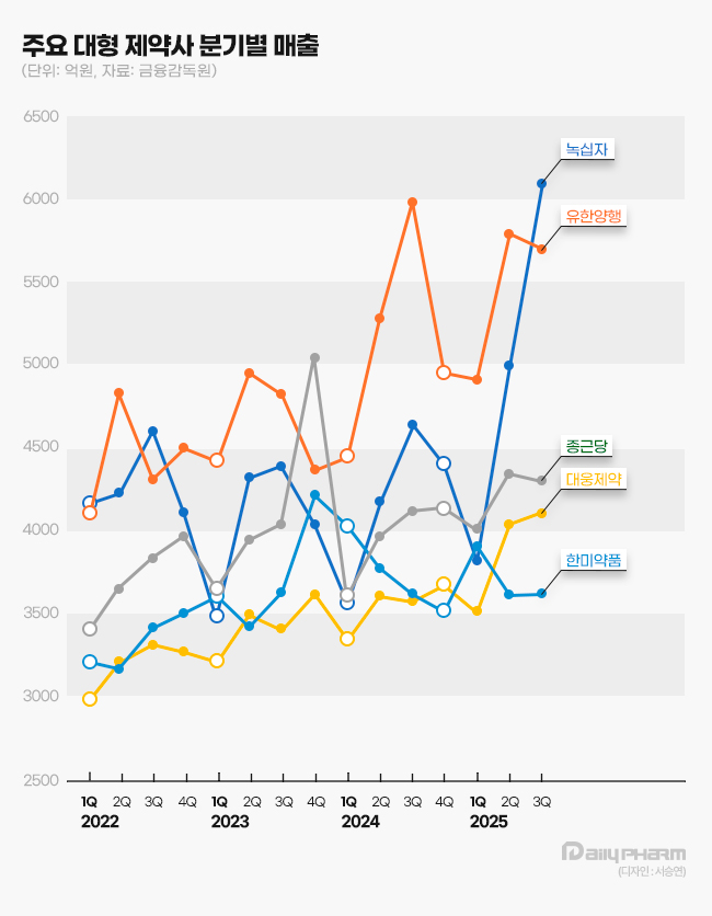 유한양행은 2022년 3분기 매출 4315억원에서 작년 3분기 5700억원으로 3년 동안 32.1% 증가했다. 같은 기간 녹십자의 매출은 4597억원에서 6095억원으로 32.6% 늘었다. 종근당의 작년 3분기 매출은 4298억원으로 3년 전보다 19.9% 늘었고 대웅제약은 3319억원에서 4118억원으로 24.1% 증가했다.