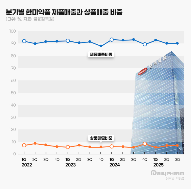 지난해 3분기 한미약품의 제품매출은 3267억원으로 회사 매출 3623억원의 90.2%를 차지했다. 제품매출은 기업이 직접 생산해 물건을 판매해 얻은 매출을 말한다. 2024년 한미약품의 제품매출은 1조3779억원으로 전체 매출의 92.1%에 달했다. 한미약품은 지난해 1분기와 2분기에도 제품매출이 전체 매출의 90%를 상회했다.