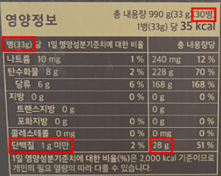 33g 한 병당 6g의 당류가 포함돼 있어 자칫 식사 후, 혹은 공복에 알부민을 섭취할 경우 건강에 독이 될 수도 있다는 설명이다.