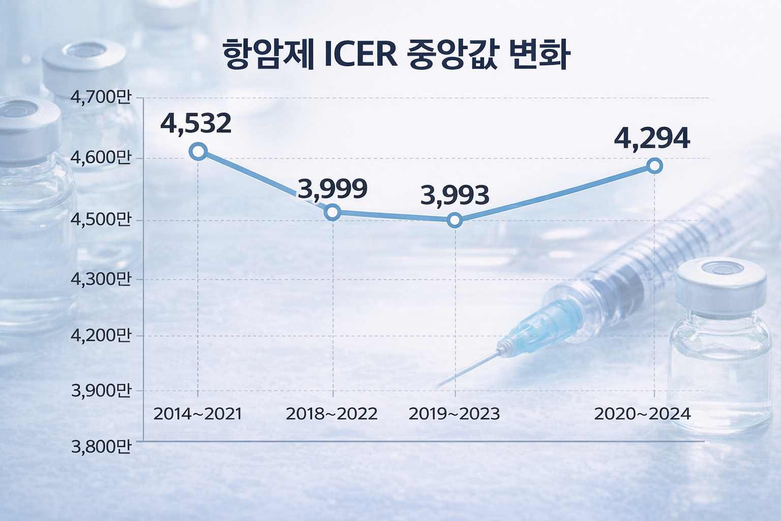2014년~2021년 항암제 ICER 중앙값은 4532만원이었다. 2018년~2022년은 3999만원, 2019년~2023년은 3993만원, 2020~2024년은 4294만원이다.