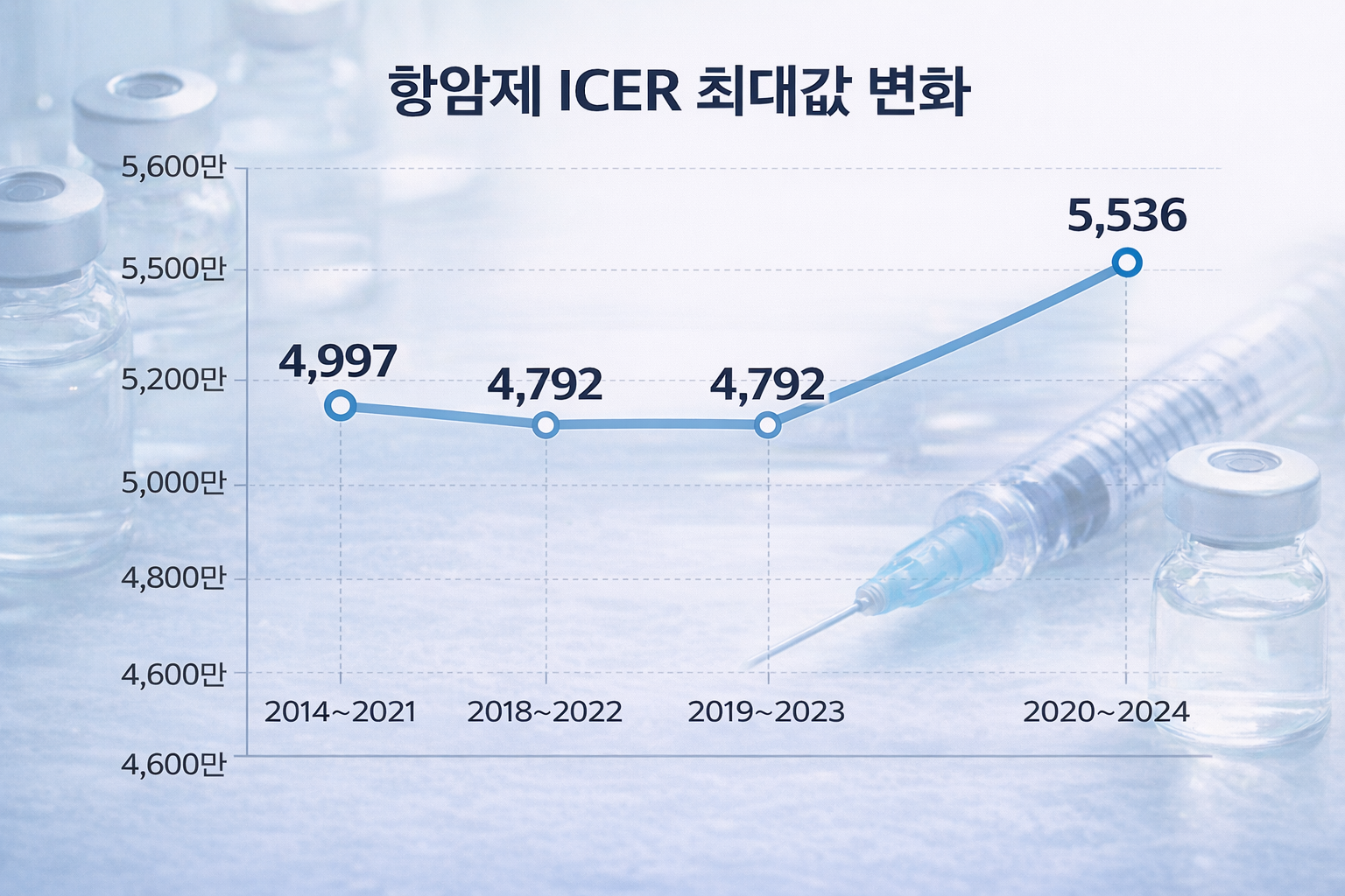 한 번도 5000만원을 넘지 못했던 ICER 최대값은 2020~2024년 집계결과에서 5536만원으로 급상승했다. 꼭 필요한 항암제에 대해서는 탄력적으로 비용효과성을 인정하고 보장성을 강화했다는 뜻이기도 하다.