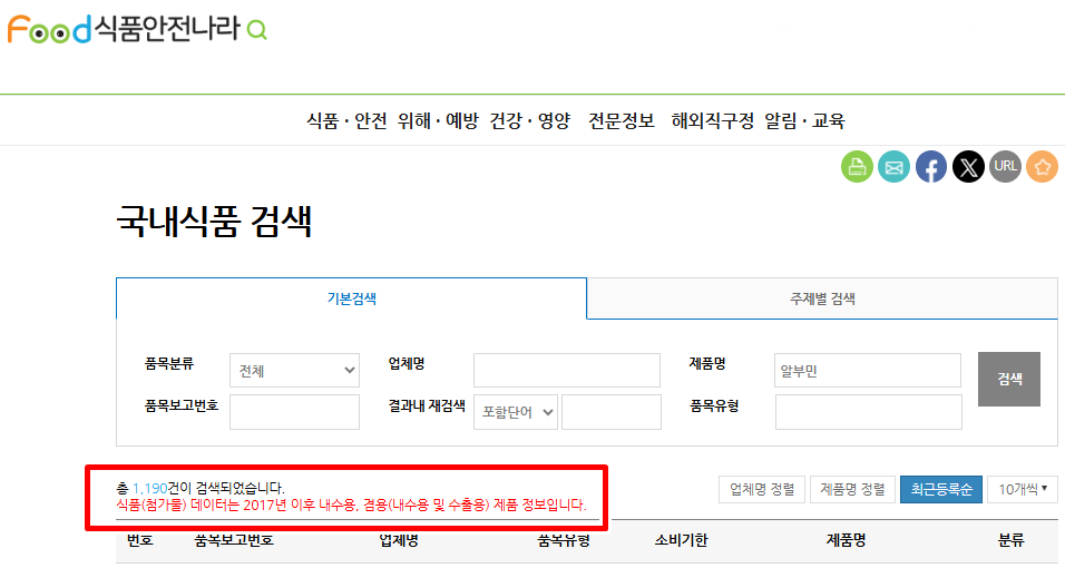 현재 식품안전나라에 알부민으로 검색했을 때 나오는 국내식품은 1190개(26년 1월 9일 기준)다. 올해 1월에만 들어서도 ▲2일 6건 ▲5일 6건 ▲6일 10건 ▲7일 4건 ▲8일 8건 등 34개 품목이 신규 신고되는 등 연일 품목 수가 늘어나고 있다.