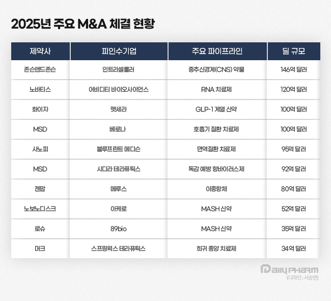 다만 2023년과 달리 무차별적 대형 인수가 아닌 질환·기전·플랫폼이 명확히 검증된 영역에만 자본이 집중되고 있다는 점에서 M&A의 성격 자체는 한층 정교해졌다는 평가다.