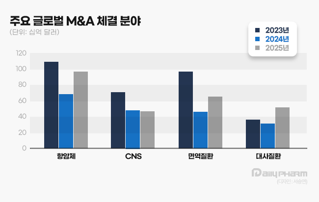 다만 과거처럼 항암제 중심의 공격적 인수보다는 대사질환·CNS·희귀질환 등 비교적 장기 성장성이 확실한 영역으로 무게중심이 이동했다는 점이 2025년 체결된 M&A의 가장 큰 특징이다.