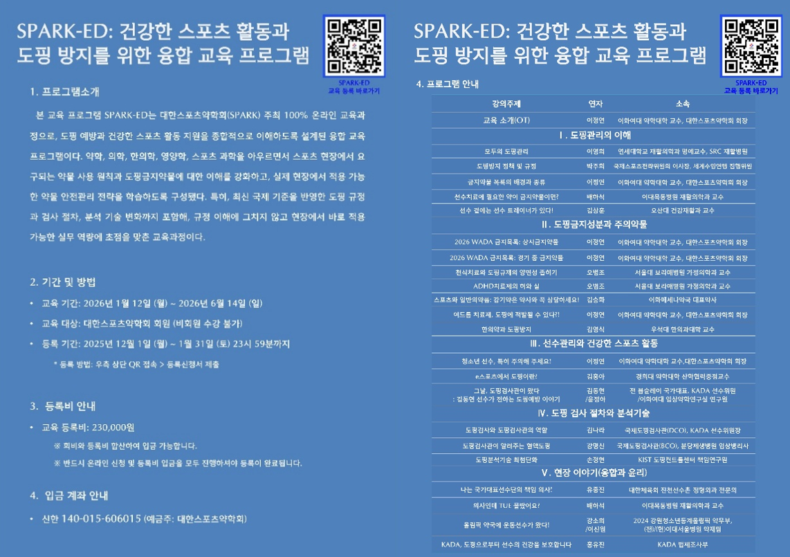 'SPARK-ED'는 약학, 의학, 한의학, 영양학, 체육과학을 아우르며 스포츠 현장에서 요구되는 약물 사용 원칙과 도핑금지약물에 대한 이해를 강화하고 실제 현장에서 적용 가능한 약물 안전관리 전략을 학습하도록 구성됐다.