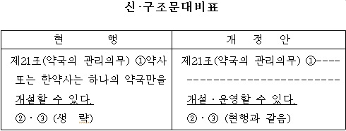 서영석 더불어민주당 국회의원이 대표 발의한 해당 법안은 약사법 제21조(약국의 관리의무) 제1항 문구를 기존 ‘약사 또는 한약사는 하나의 약국만을 개설할 수 있다’에서 ‘하나의 약국만을 개설·운영할 수 있다’로 수정하는 내용을 담고 있다.