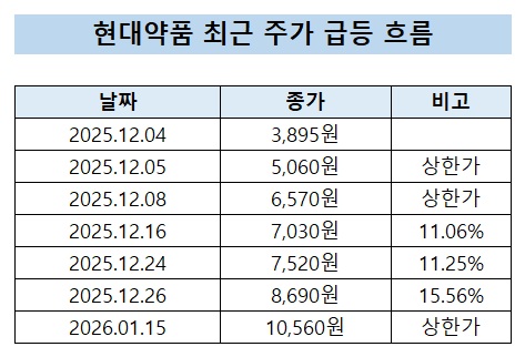 [데일리팜=이석준 기자] 현대약품 주가가 급등하고 있다. 한 달간 상한가 3번과 두 자릿수 상승 6번을 기록했다. 다만 실적, R&D, 지배구조 등 기업 펀더멘털에 따른 상승으로 보기는 어렵다는 평가가 나온다. 업계는 이번 급등을 ‘탈모 테마’에 쏠린 단기 수급 과열로 보고 있다.