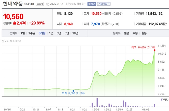 현대약품 주가는 지난해 12월 5일과 8일 2거래일 연속 상한가로 마감했다. 이탈리아 제약사 코스모파마슈티컬스의 남성형 탈모 치료 신약 ‘클라스코테론’ 5% 용액이 임상 3상에서 유의미한 효과를 입증했다는 소식이 전해진 직후다. 현대약품이 해당 회사 일부 제품의 국내 유통에서 협업 관계를 맺고 있다는 점이 주가와 연동된 것으로 풀이된다.