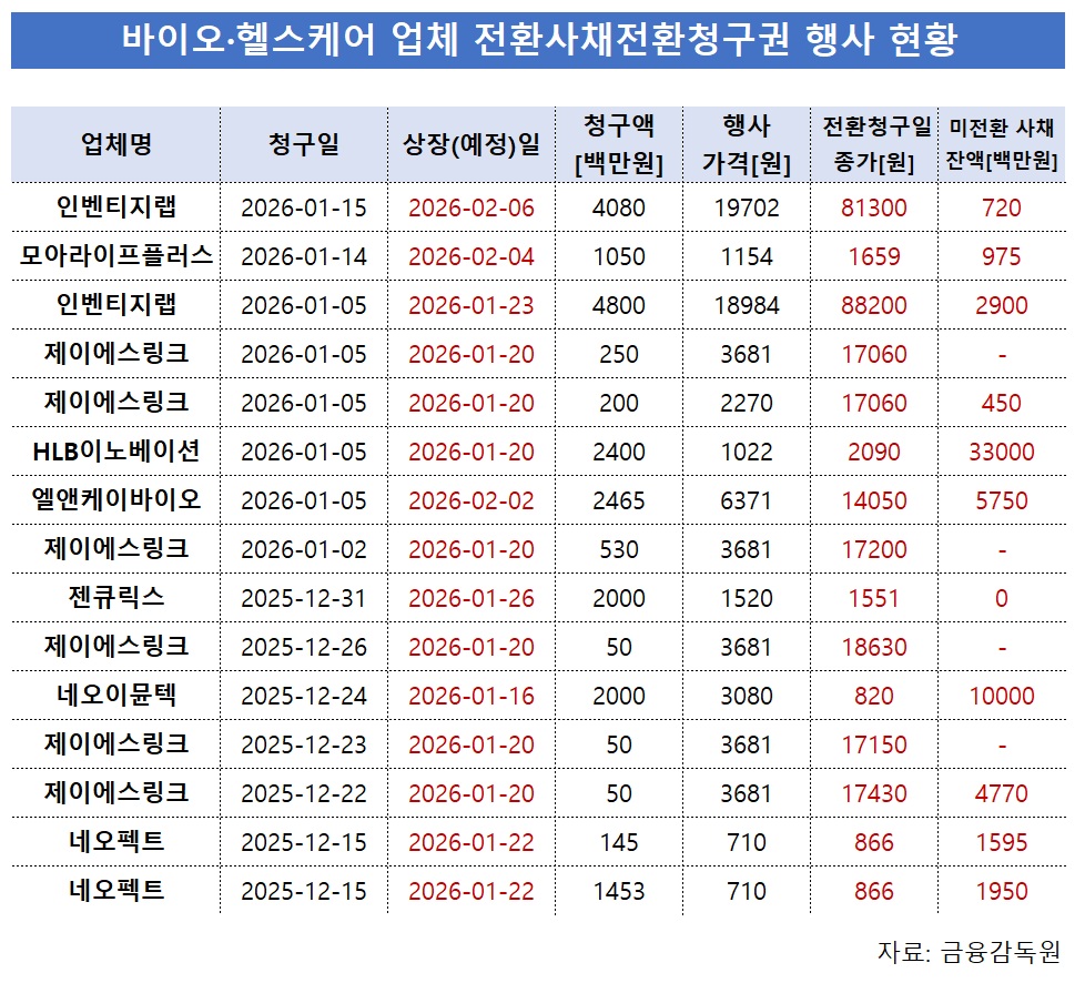 바이오·헬스케어 CB 전환청구권 행사 공시가 잇따르고 있다. 최근 한 달간 관련 공시만 15건을 넘어선다.