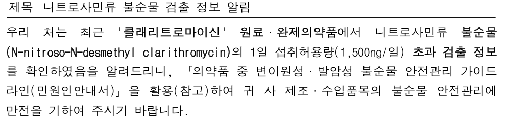 식약처는 클래리트로마이신 원료·완제의약품에서 니트로사민류 불순물(N-nitroso-N-desmethyl clarithromycin) 초과 검출 정보를 확인했다는 내용을 공지하고, 제조·수입품목의 불순물 안전관리에 만전을 기할 것을 당부했다. 클래리트로마이신 성분 의약품의 허가가 취소·취하·유효기간 만료됐더라도 시중 유통품이 존재하면 안전관리 대상에 포함된다.
