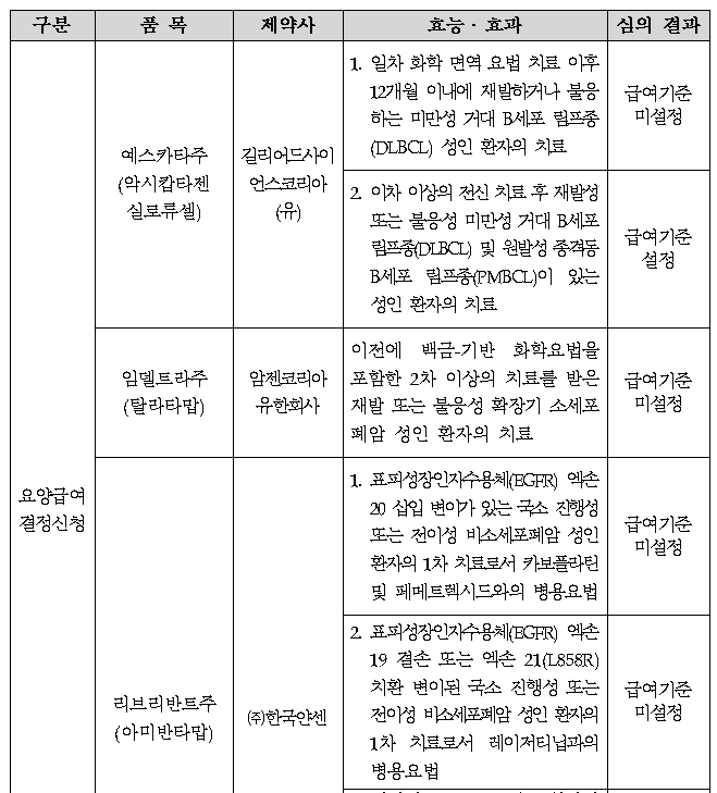 심의 결과, 예스카타는 '이차 이상의 전신 치료 후 재발성 또는 불응성 미만성 거대 B세포 림프종(DLBCL) 및 원발성 종격동 B세포 림프종(PMBCL)이 있는 성인 환자의 치료' 두번째 적응증만 급여기준이 설정됐다.