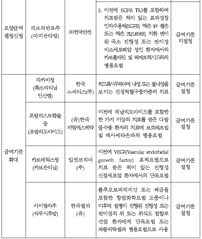 신약과 달리 급여기준을 확대하는 약제들은 모두 급여기준 설정에 성공했다. 자카비정, 포말리도마이드 성분 약제, 카보메틱스정, 사이람자주가 급여기준이 설정됐다.