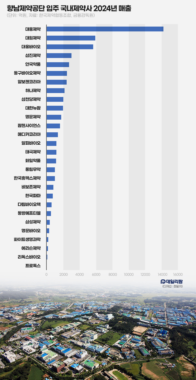 이중 의약품을 취급하는 제약사는 총 28곳이다. 금융감독원에 따르면 항남제약공단에 입주한 제약사 28곳은 지난 2024년 총 5조8552억원의 매출을 기록했다. 업체당 평균 2091억원의 매출을 올렸다.