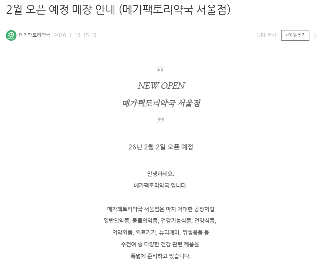 블로그에도 '메가팩토리약국 서울점은 마치 거대한 공장처럼 일반의약품, 동물의약품, 건강기능식품, 건강식품, 의약외품, 의료기기, 뷰티케어, 위생용품 등 수천여 종 다양한 건강 관련 제품을 폭넓게 준비하고 있다'며 '나와 가족은 물론, 소중한 반려동물의 건강까지 일상 속 건강을 함께할 수 있는 공간으로 찾아뵙겠다'는 글이 최근 게시됐다.