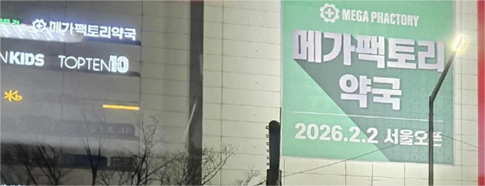 홈플러스 금천점 외벽에도 '메가팩토리약국 2026.2.2 서울오픈' 대형 현수막 이외 '메가팩토리약국' 전면간판이 부착됐다.