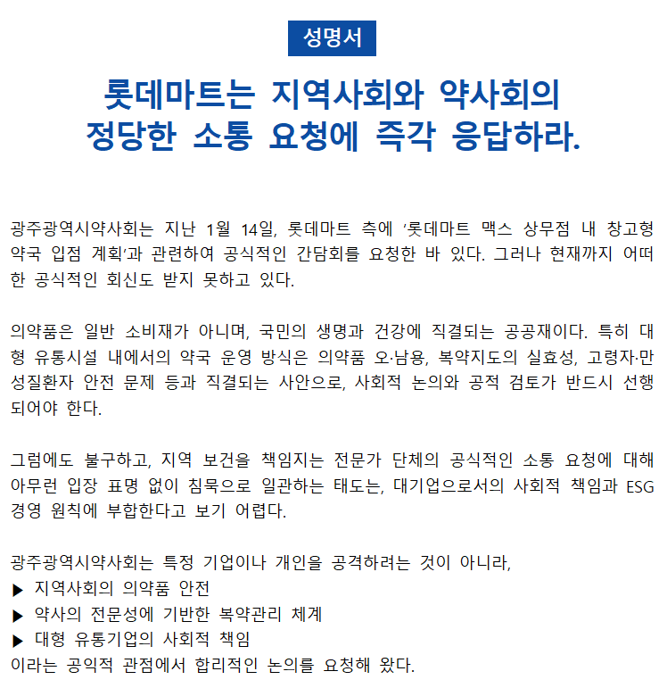 광주시약사회는 "지역 보건을 책임지는 전문가 단체의 공식적인 소통 요청에 아무런 입장 표명 없이 침묵으로 일관하는 태도는 대기업으로서의 사회적 책임과 ESG 경영 원칙에 부합한다고 보기 어렵다"며 "대형 유통기업의 사회적 책임이라는 공익적 관점에서 합리적인 논의가 필요한 사안이며, 롯데마트는 더 이상 침묵으로 일관해서는 안된다"고 일갈했다.