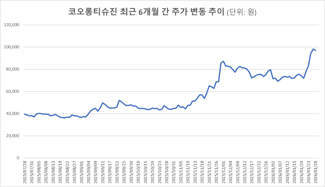 [데일리팜=차지현 기자] 코오롱그룹의 바이오 자회사 코오롱티슈진이 주가가 가파른 상승세를 이어가고 있다. 법적 불확실성이 완화되면서 투자심리 부담이 줄어든 데다 골관절염 유전자치료제 재개 가능성에 대한 기대감이 반영된 영향으로 풀이된다.