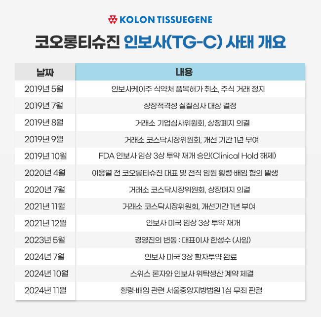 이 과정에서 인보사 사태를 둘러싼 법적 분쟁도 본격화됐다. 성분 변경 사실이 뒤늦게 드러난 이후 투자자와 환자로부터 잇따라 손해배상 소송이 제기되면서 인보사의 국내 판매·허가 주체였던 코오롱생명과학과 개발사인 코오롱티슈진이 공동 피고로 지목됐다. 이와 함께 형사 수사와 행정 처분도 병행되며 코오롱그룹의 바이오 계열사는 장기간 법적 분쟁에 휘말려 왔다.