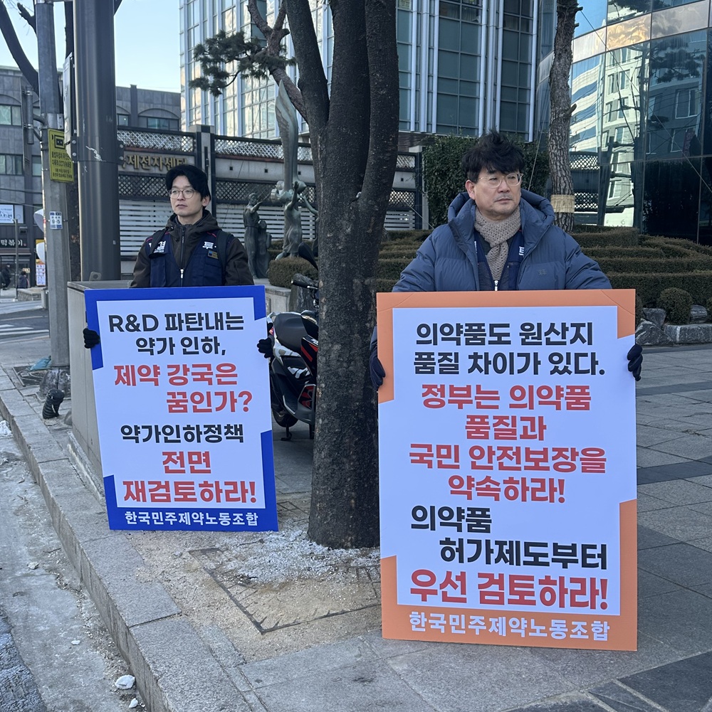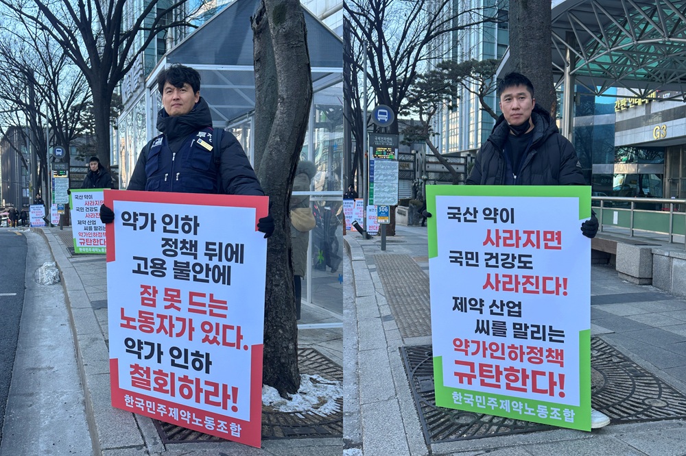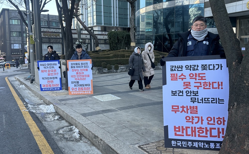 건강보험정책심의위원회(건정심) 회의를 앞둔 29일 오후 1시 한국민주제약노동조합(KPDU)은 서울 서초동 건강보험심사평가원 앞에서 피켓 시위에 나섰다. KPDU는 주요 다국적 제약사 노조원으로 구성된 단체로, 이번 정부의 약가 개편안이 가져올 충격을 직접 알리기 위한 행동에 돌입했다.