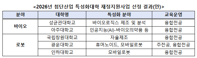 올해는 실물 인공지능(피지컬 인공지능, Physical AI) 시대를 맞아 차세대 기술 주권 확보를 위한 로봇 인재의 중요성을 고려해 로봇 분야를 신설하고 3개교를 선정했고 의료 기술 혁신의 핵심으로서 신성장동력으로 주목받고 있는 바이오 분야 2개교를 포함해 총 5개 대학을 선정했다.
