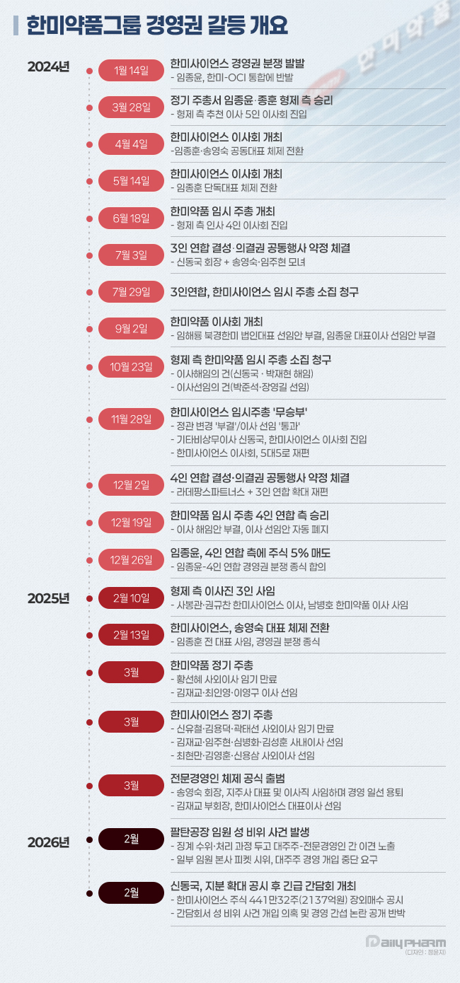 한미약품그룹을 둘러싼 경영권 갈등은 2024년 초 송영숙·임주현 모녀 측이 OCI그룹과 통합을 추진하면서 촉발됐다. 이에 임종윤·종훈 형제 측이 반발하며 신주발행금지 가처분 신청을 제기했고 갈등은 법적 다툼과 주주총회 표 대결로 번졌다.