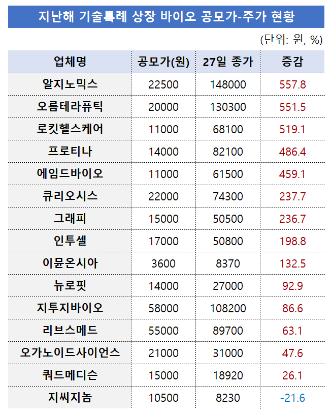 - 작년 기술특례 상장 15곳 중 14곳 공모가 상회, 알지노믹스 6.6배 급등