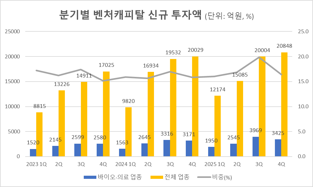 3일 벤처캐피탈협회에 따르면 지난해 바이오·의료 분야 신규 투자 금액은 1조1889억원으로 전년 1조0695억원 대비 11.2% 증가했다. 2021년 이후 4년 만에 가장 높은 수준이다.