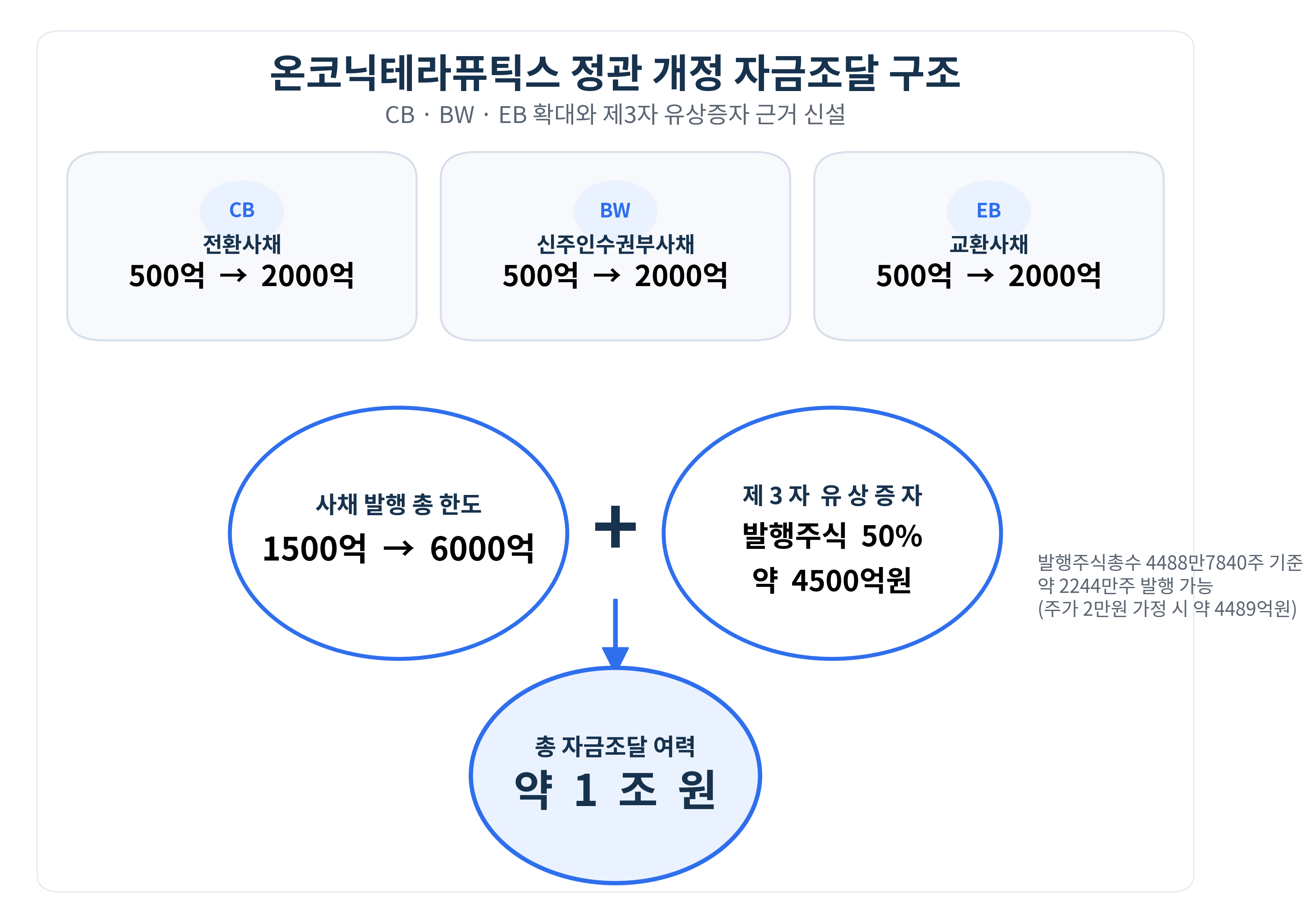 [데일리팜=이석준 기자] 제일약품 자회사 온코닉테라퓨틱스가 자금조달 구조를 대폭 확대한다. 전환사채(CB)와 신주인수권부사채(BW), 교환사채(EB) 발행 한도를 각각 2000억원으로 늘리고 제3자 배정 유상증자 근거를 정관에 새로 마련하는 것이 핵심이다. 사채와 유상증자를 합치면 1조원 안팎의 자금조달 구조가 열리는 셈이다.