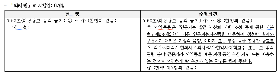 약사법, 의료기기법, 화장품법 내 부당 광고나 과장 광고를 금지하는 조항에 AI를 이용해 생성한 가상의 음향, 이미지, 영상 등을 활용한 광고로서 의사·치과의사·한의사·수의사·약사·한약사·대학교수 또는 그 밖의 관련 분야 전문가가 의약품을 보증·지정·공인·추천·지도 또는 사용하는 것으로 오인하게 할 우려가 있는 광고를 하지 못하도록 명시하는 게 핵심이다.