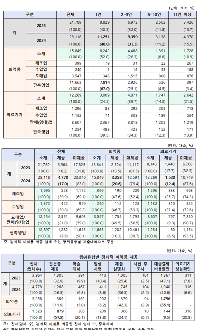 제조업은 임상시험 연구비 지원 중심, 수입업·판촉영업은 제품설명회 중심, 도매업·판매(임대)업은 대금결제 비용할인을 중심으로 지출했다.