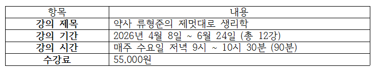 ‘약사 류형준의 제멋대로 생리학’을 주제로 한 이번 강좌는 오는 4월 8일부터 6월 12일까지 매주 수요일 저녁 9시부터 10시 30분까지 90분간 진행되며 총 12강으로 구성됐다.