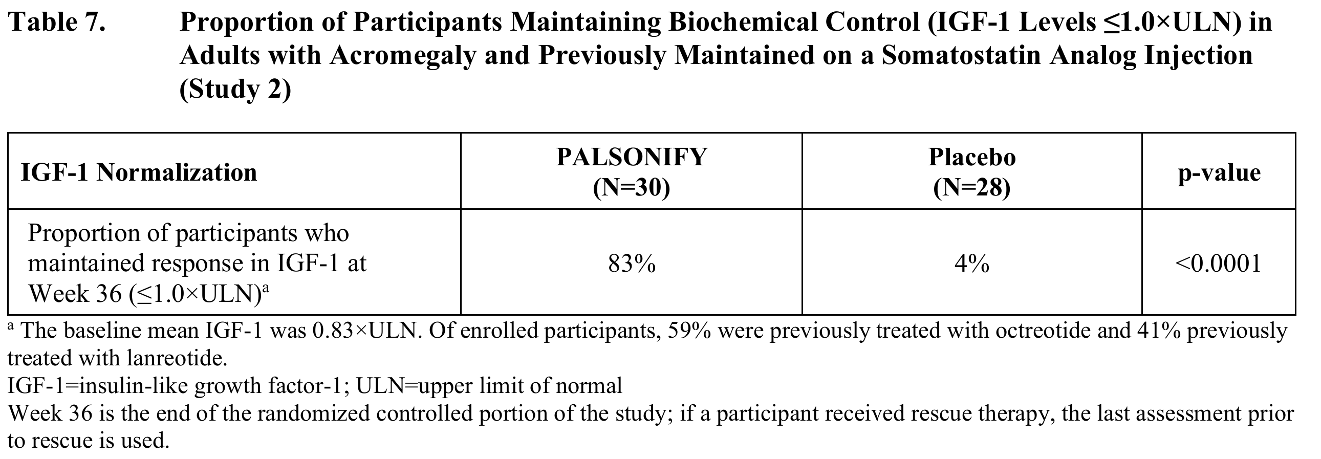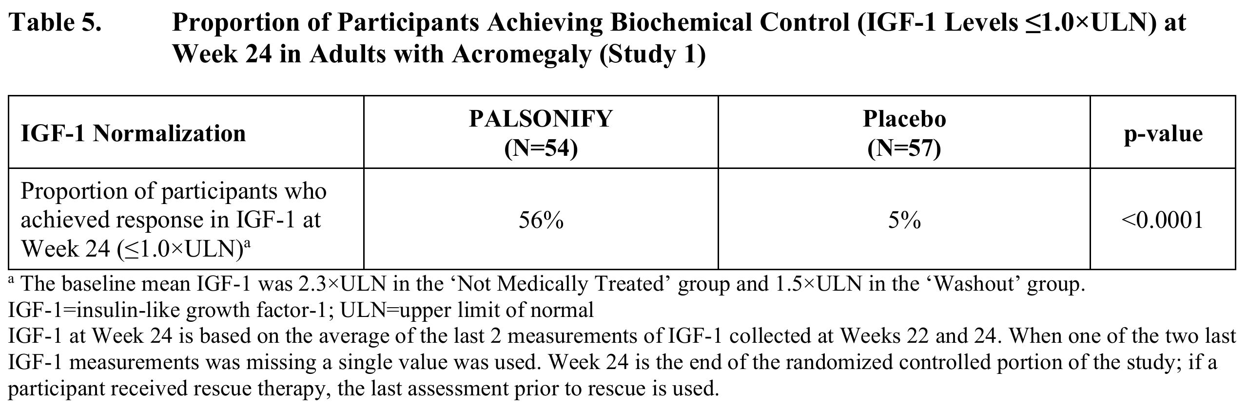 본 연구의 1차 평가 변수(primary endpoint)는 IGF-1 수치가 정상 상한치 이하(≤1.0×ULN)로 감소하여 생화학적 조절(biochemical control)을 달성한 환자의 비율이었다. 24주 치료 후 평가 결과, PALSONIFY 투여군의 56%가 생화학적 조절을 달성한 반면 위약군에서는 5%만이 해당 기준을 충족하였다. 이러한 차이는 통계적으로 유의하였으며(p<0.0001), PALSONIFY가 위약 대비 말단비대증 환자의 IGF-1 수치 조절에 있어 유의하게 높은 치료 효과를 나타냄을 보여주었다(Table 5).